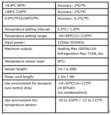 120 volt, 15 amp thermostat with 3-prong plug (5 foot cord) and temperature probe, range -30°C to 99°C (-22°F to 210°F).